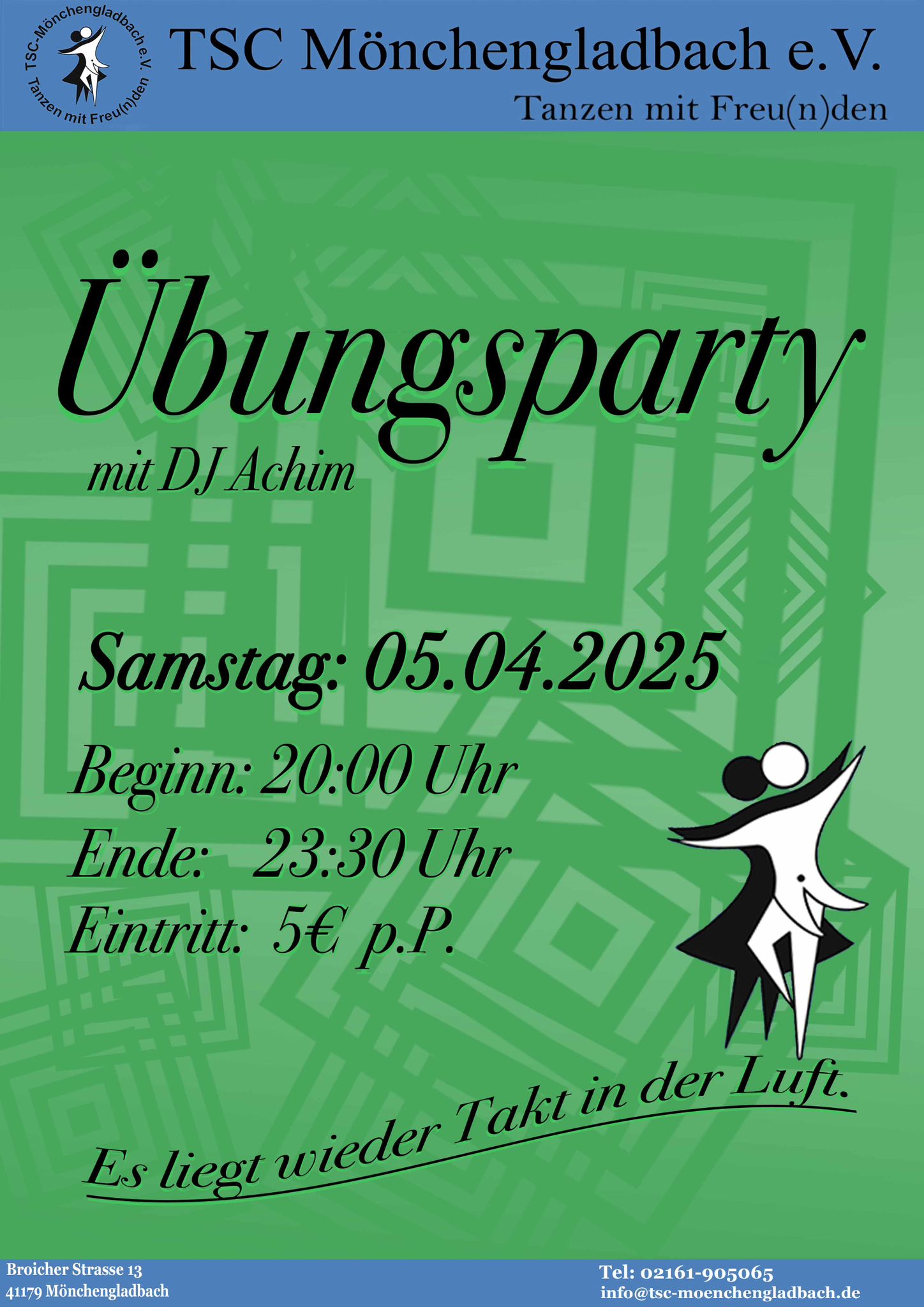 Unsere nächste Übungsparty steht an und unser DJ Achim wird euch mit schwungvoller Musik an diesem Abend begleiten.
