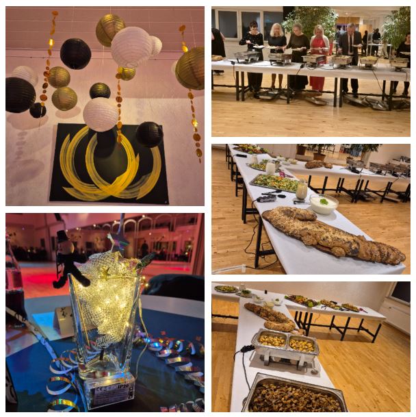 Über einhundert Tanzfreunde von nah und fern füllten den Großen Saal mit guter mitgebrachter Laune, chicken Outfit, großer Bewegungsfreudigkeit und heißer Liebe zur Musik aller Art. Der große Saal strahlte Ball-Atmosphäre aus, vor allem durch eine in gold–schwarz-weiß und in Bronze gehaltene Deko mit herabhängenden, goldenen Ketten und verschieden großen Lampions dazu kam flackerndes Flashlight. Das blank gewienerte Tanz-Parkett und ein leckeres Büffet mit Spezialitäten von Fleisch, von Vegetarischem und süßem Nachtisch rundete das Wohlgefühl der Gäste noch ab.